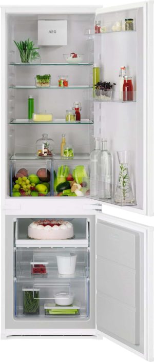 OSC5S181ESSelvarfrimende køle-/fryseskab fra AEG med LowFrost system, Flexi-Space glashylder, 198 liter kølevolumen og frysekapacitet på 73 liter.