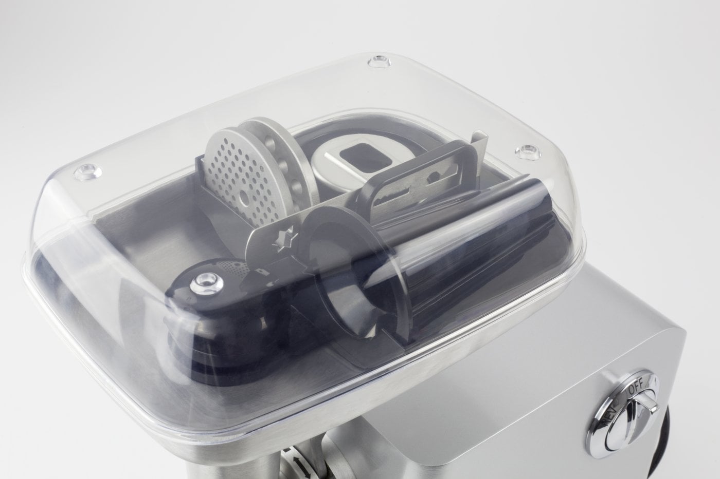 Kødhakkeren FW2000 fra Caso er en stærk partner i alle køkkener. Den har en stærk motor med en nominel effekt på 800 W og er låst ved 2000 W. Den er udstyret med et støbt aluminiumskabinet og en stor påfyldningsbakke i aluminium, hvorpå alt tilbehør kan opbevares under et gennemsigtigt plastlåg. Den har en forskæringsteknik, et frem- og tilbageløb, samt 2 hastighedsniveauer. Der medfølger rustfri stål skære indsatser, på henholdsvis 3mm, 5mm og 8mm, samt en pølsestopper, indsats til cookies og en tamper til nemmere påfyldning. Læs hele beskrivelsen