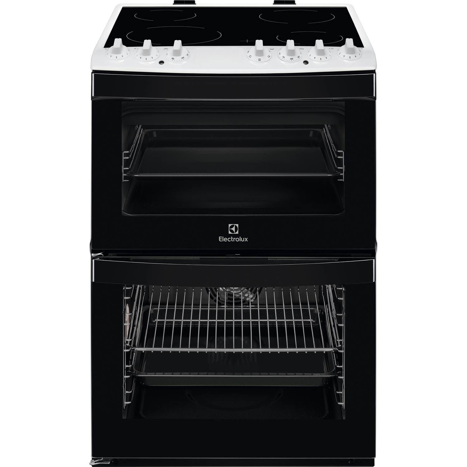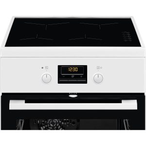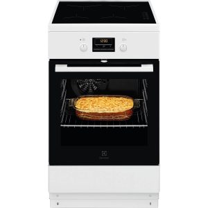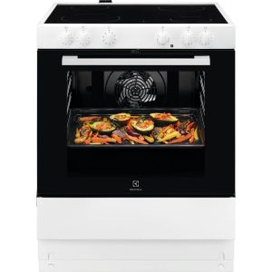 Electrolux LKR65000SW er et komfur med en hurtig glaskeramisk kogeplade, rummelig varmluftsovn og praktisk ekstra ovn – perfekt til fleksibel spisning.