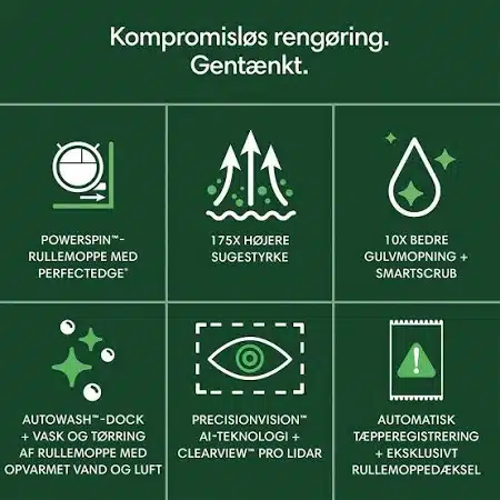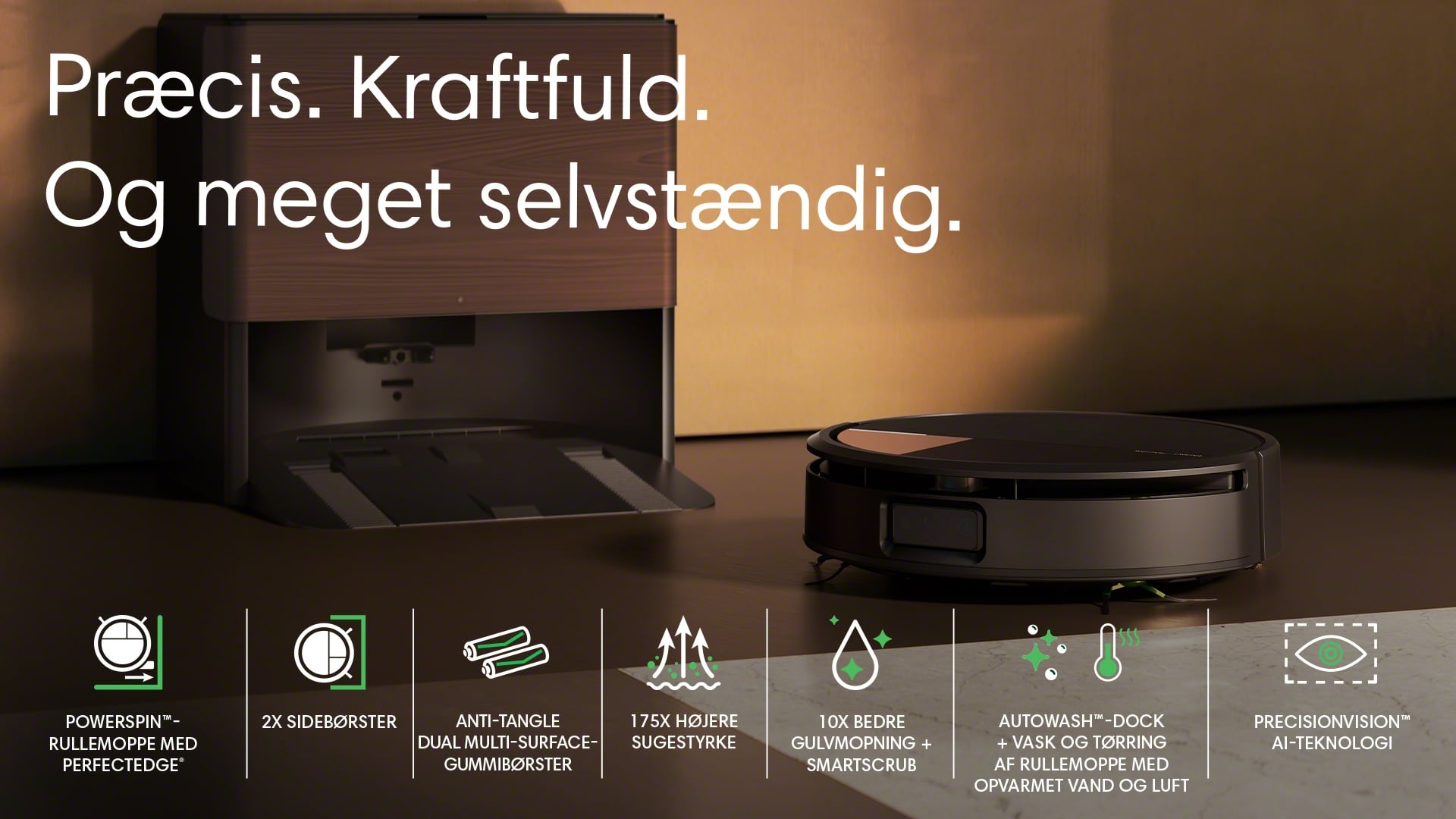 Innovativ PrecisionVision™ AI-teknologi muliggør intelligent navigation omkring objekter i alle størrelser – ledninger, sko, legetøj og efterladenskaber fra kæledyr*.