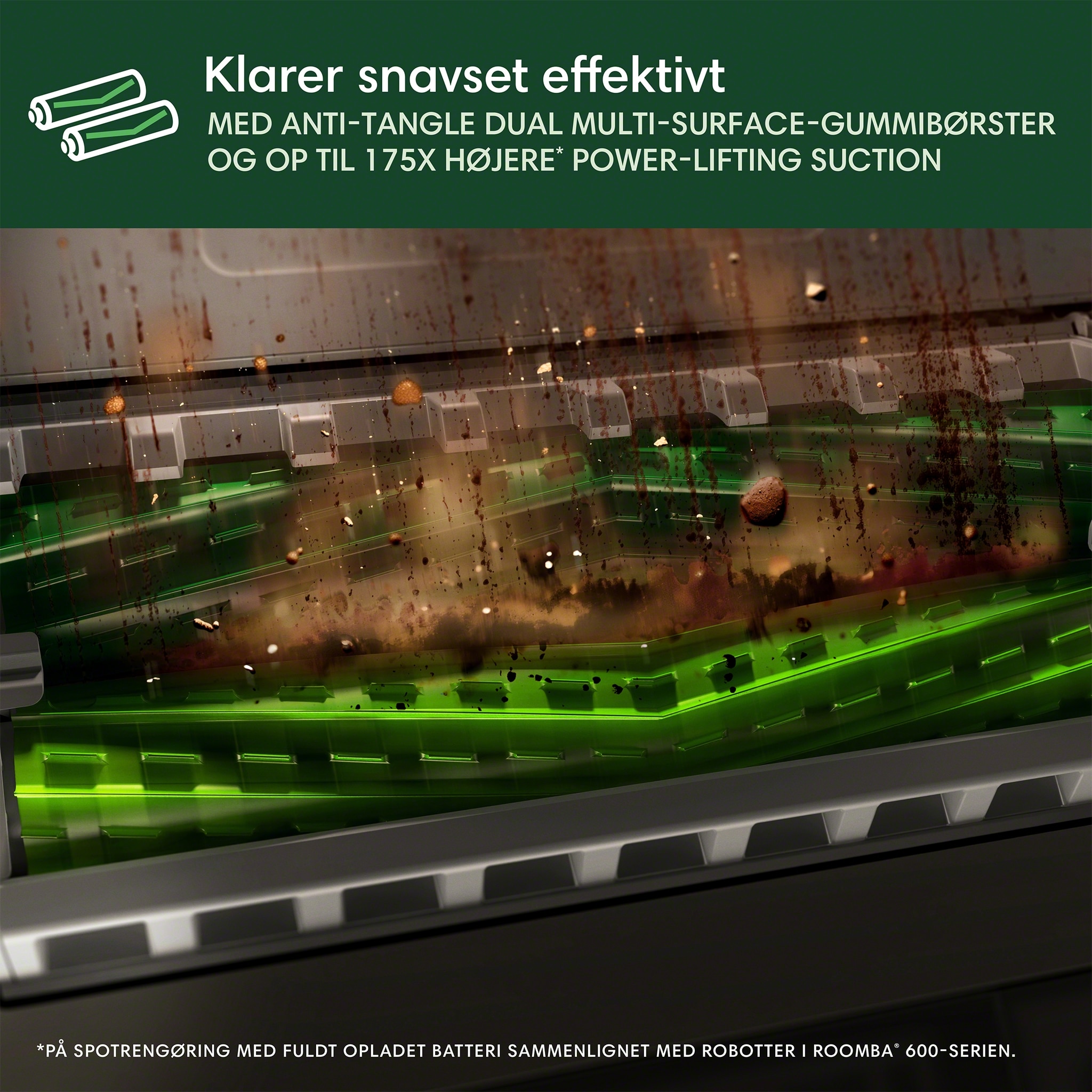 Fjerner snavs, uanset om det er fra krummer eller poteaftryk fra kæledyr, med 70x højere sugestyrke* DualClean™-rengøringsklude, SmartScrub, Multi-Surface gummibørste og sidebørste.